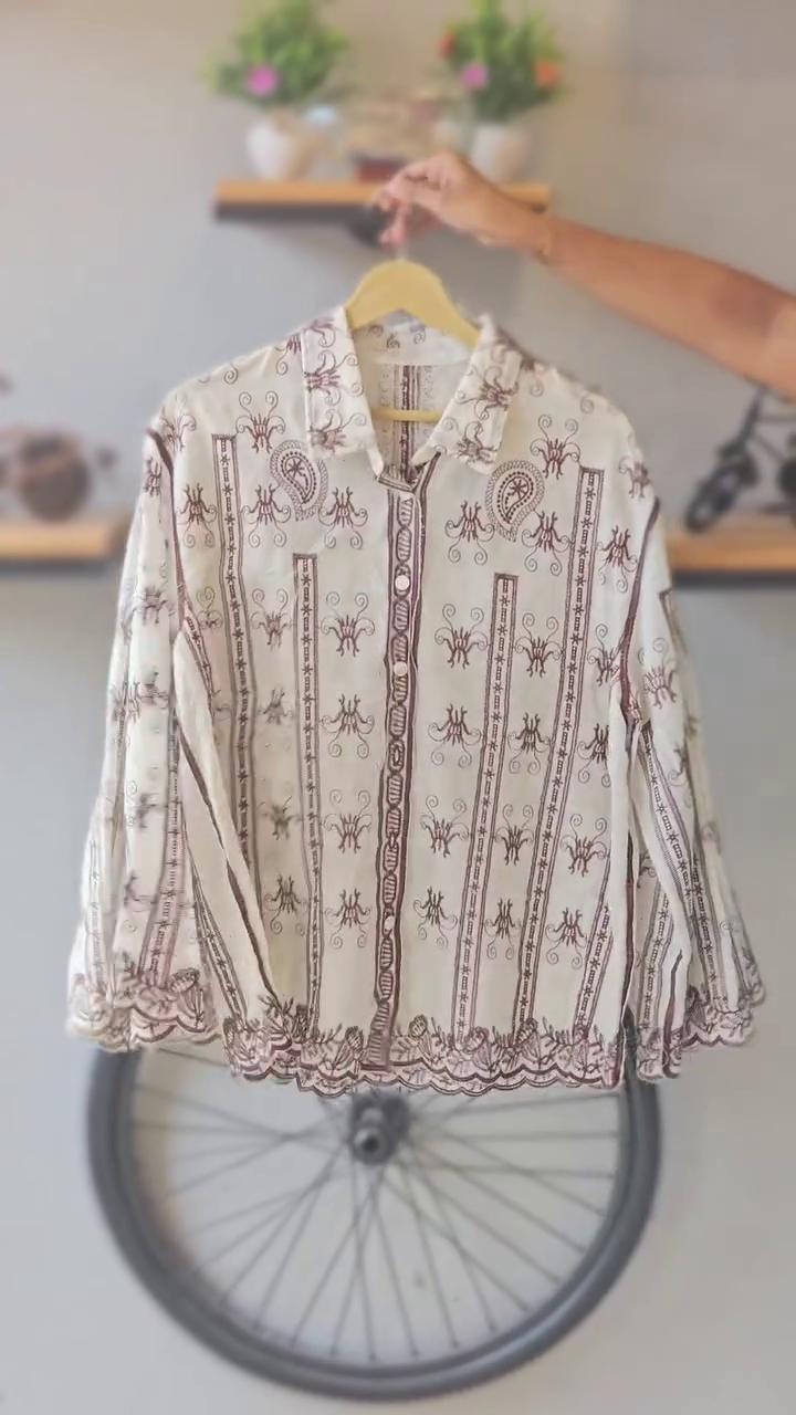 The hem is finished with a scalloped, embroidered border that enhances the garment’s artistic flair, making it equally perfect for casual day-outs or festive events where you want a subtle statement. Whether you’re heading to a café, a weekend market stroll, or just relaxing at home, this shirt keeps your style sharp yet grounded in tradition.
