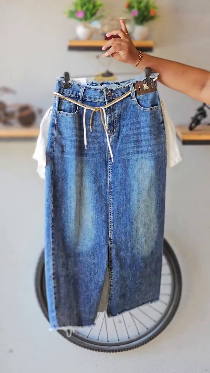 Paired with a high-waisted, raw-hem denim skirt, this set adds just the right touch of laid-back attitude. The classic blue wash is flattering and versatile, with a front seam and frayed edge for that lived-in, vintage feel.